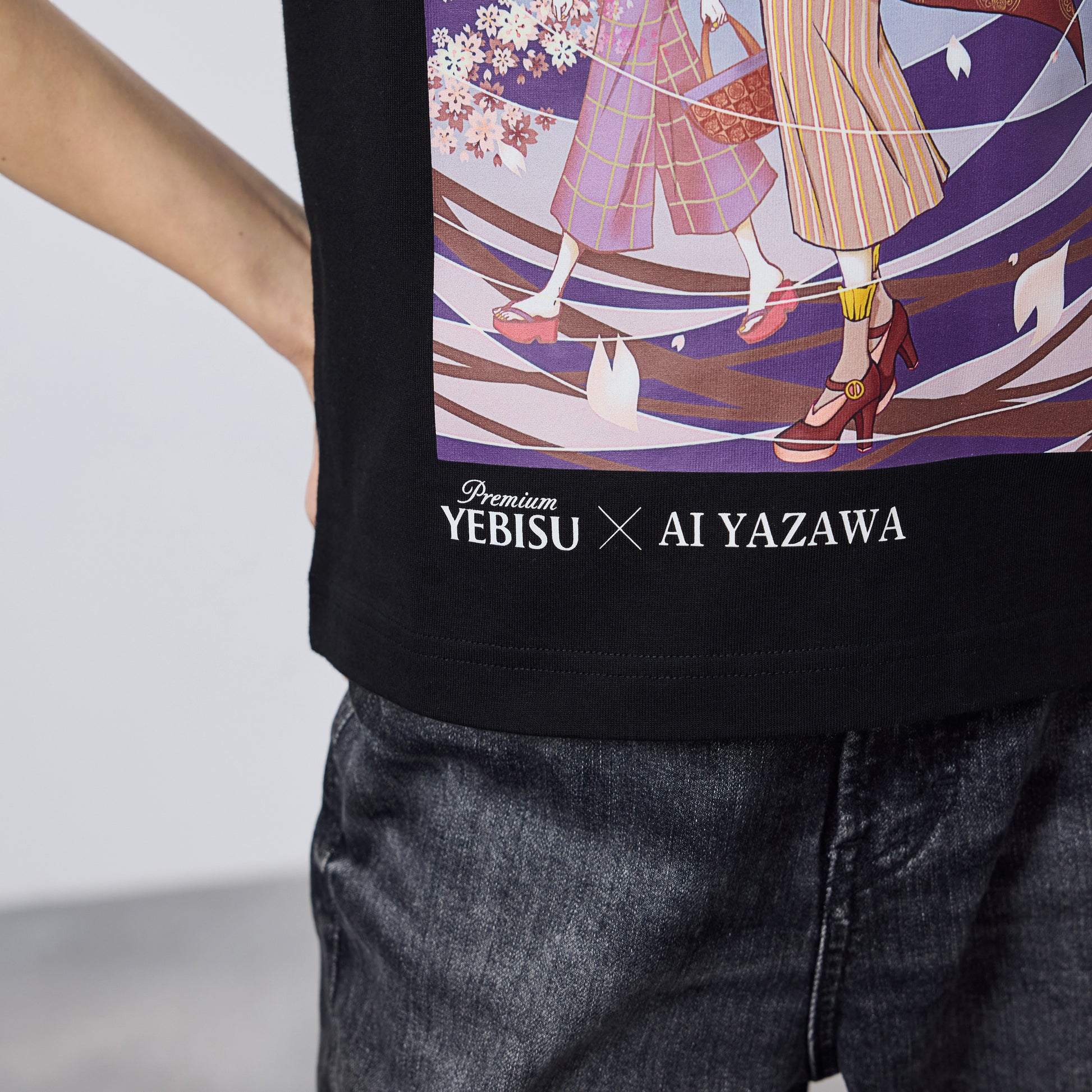 フロントにヱビスビールの歴史を語る「美人画」をモチーフに、矢沢あい氏が描く現代版の美人画「彩-あや- 第一景」をプリント。大胆な構図と華やかな色使いで描き下ろしたアートの世界観が楽しめるTシャツです。